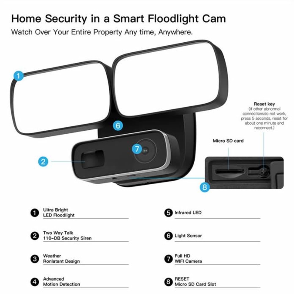 Özellikler : Mobil uygulama üzerinden Işık Kontrolü, WiFi Kamera, Sesli Alarm, Karşılık Sesli Konuşma, Kendi üzerinde bulunan SD kart desteği ile kaydetme özelliği (Sd Kart Dahil değildir), Gece Görüş Özelliği